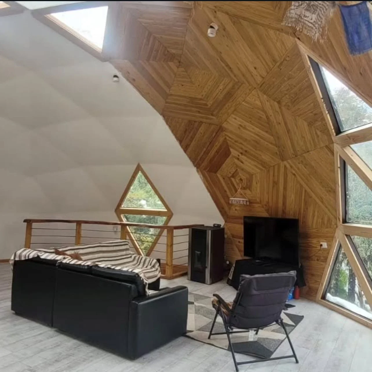 Situated along the banks of the Cautín River, the dome features a scenic deck designed for taking in the surrounding landscape and the steady rhythm of the water below. Inside, an expansive communal living area provides a comfortable and inviting space to gather, relax, and share the day’s experiences.